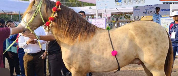 Newsworldmarathi Baramati : बारामतीत सुरू असलेल्या कृषी प्रदर्शनामध्ये हैदराबादच्या नवाबांनी तब्बल 11 कोटी रुपये किमतीचा सोनेरी रंगाचा घोडा आणल्याने प्रेक्षकांची मोठी गर्दी उसळली आहे. या घोड्याचे वैशिष्ट्य त्याचा चमकदार सोनेरी रंग, त्याची अभिजात रचना आणि अप्रतिम देखावा आहे.