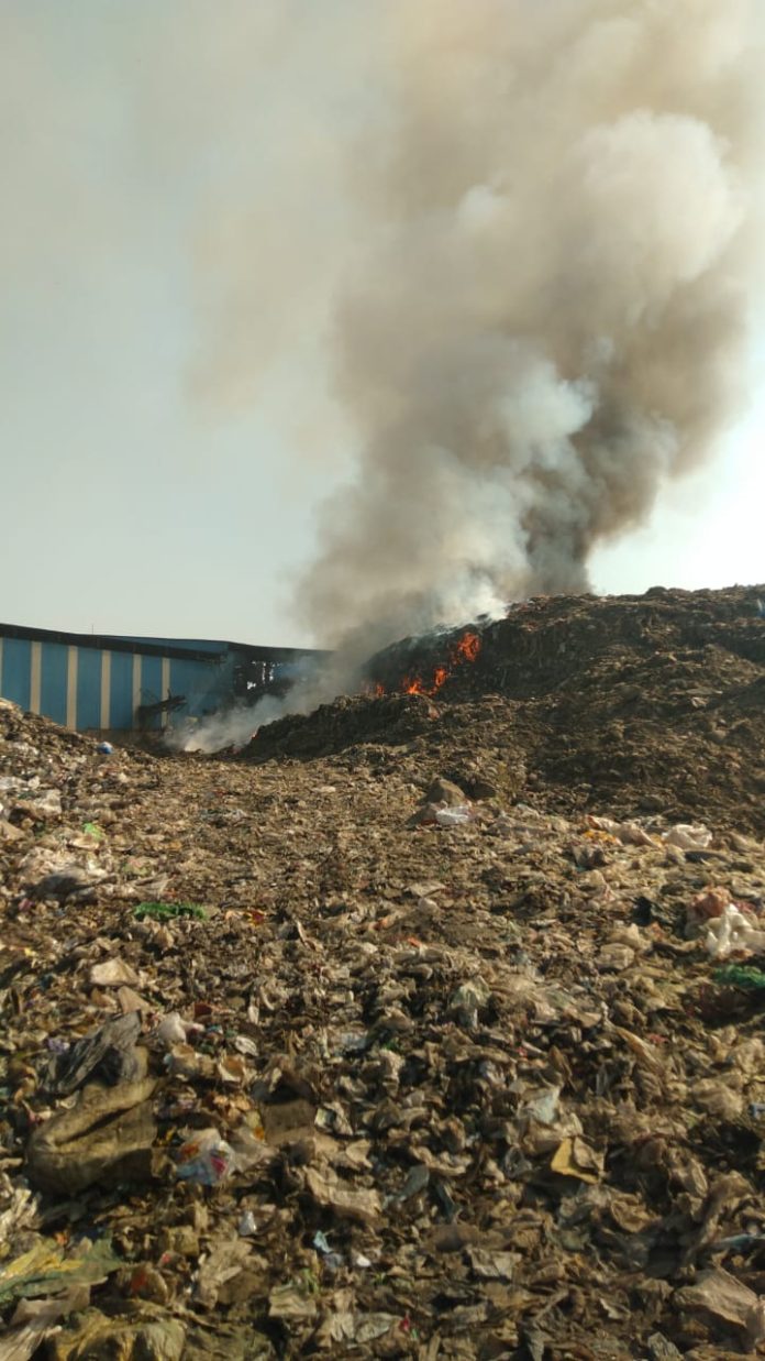 वेस्टेज कचरा येथील प्रकल्पाच्या शेजारी पडला असून तापमान वाढल्याने या कचऱ्याला आग लागली. असे सांगितले जाते आहे. तसे दरवर्षी तापमान वाढल्याने येथील कचरा डेपोला आग लागते. यावर्षीही ही अशीच आग लागली. सायंकाळपर्यंत येथील टँकरने पाणी आणून तेथून फायर गाड्यांनी या कचऱ्याच्या भल्या मोठ्या ढिगाऱ्यावर पाणी फवारून व जेसीबी व पोकलेन च्या साह्याने आग लागलेल्या कचऱ्या हलवून जिथपर्यंत आग पोहोचली आहे तिथपर्यंत पाणी मारण्याचे काम सुरू आहे. तापमान वाढल्यामुळे ही आग लागली असून युद्धपातळीवर आग विझवण्याचे काम सुरू आहे.
