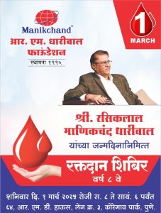 आज दिनांक १ मार्च २०२५ शनिवार रोजी श्री रसिकलाल साहेबांच्या जन्मदिनानिमित्त जास्तीत जास्त पुणेकरांनी आर एम डी बंगला नंबर ६४, लेन नंबर ३ कोरेगाव पार्क-पुणे येथे उपस्थित राहून रक्तदान करावे असे आवाहनही त्यांनी यावेळी केले. अधिक माहितीसाठी ७३५३३५४४४४ या क्रमांकावर संपर्क साधावा.