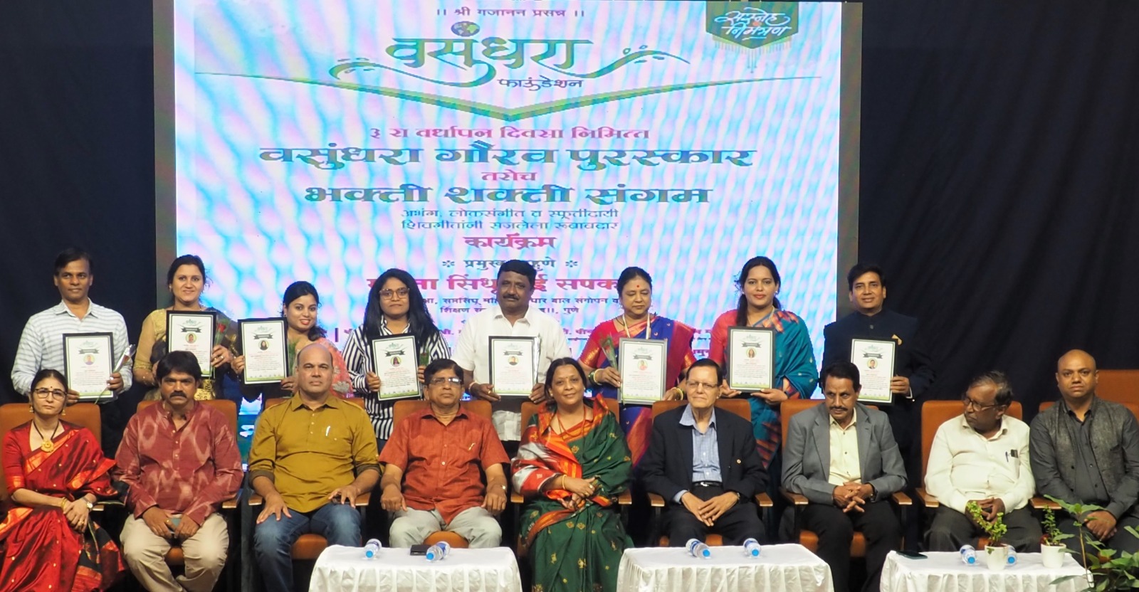 वसुंधरा फाऊंडेशनच्या तिसऱ्या वर्धापन दिनानिमित्त वसुंधरा गौरव पुरस्कार वितरण सोहळ्याचे सोमवारी (दि. 16) आयोजन करण्यात आले होते. नवी पेठेतील एस. एम. जोशी सभागृहात आयोजित कार्यक्रमात ममता सिंधूताई सपकाळ यांच्या हस्ते पुरस्कारांचे वितरण झाले. त्या वेळी त्या बोलत होत्या. ज्येष्ठ वक्ते श्याम भुर्के अध्यक्षस्थानी होते. वसुंधरा फाऊंडेशनचे अध्यक्ष धनंजय भोसले, ॲड. मनिषा भोसले यांच्यासह राजेश दातार, आनंद सराफ, मोहन ठोंबरे, पियूष शहा, शिरीष मोहिते, उदय जगताप मंचावर होते.