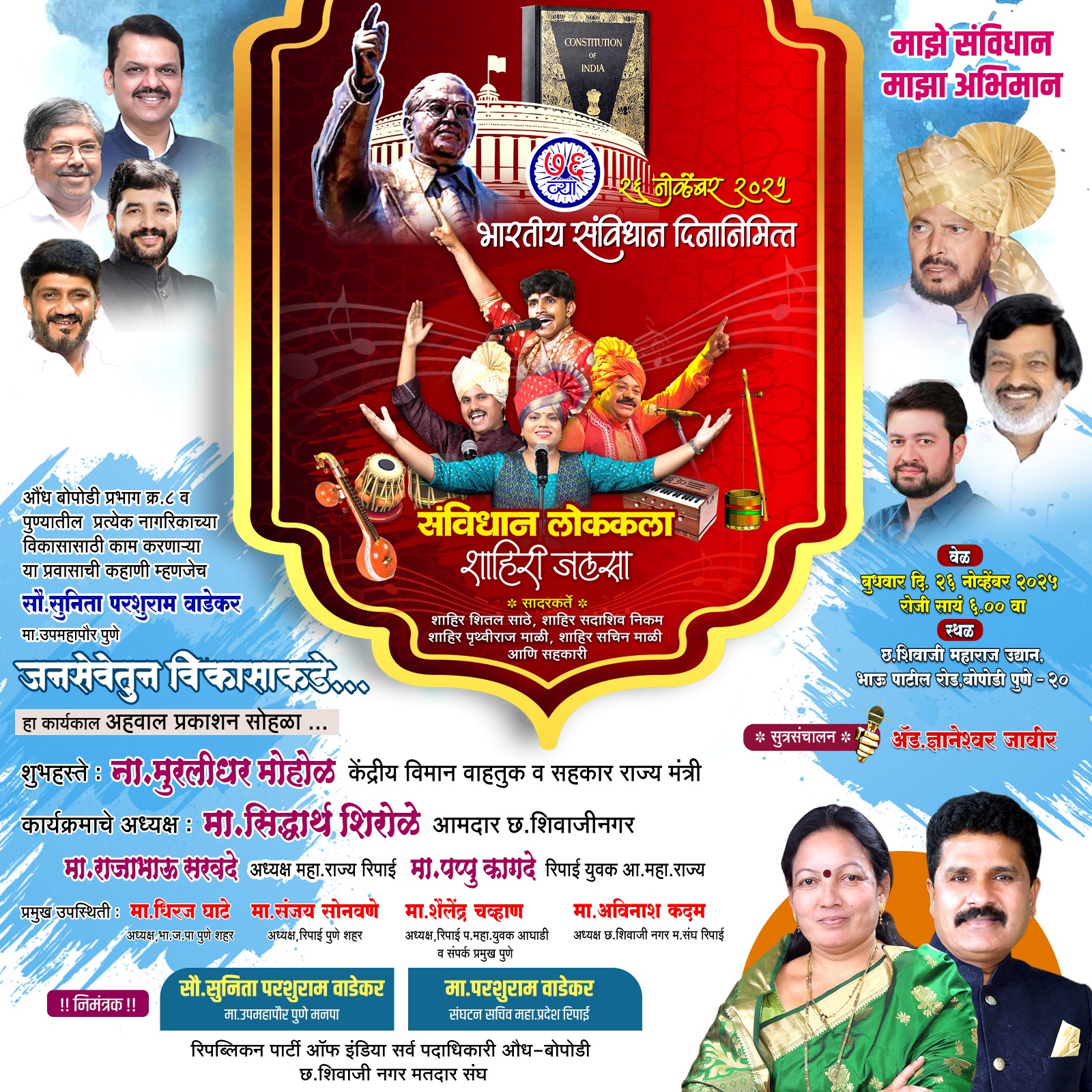 हा कार्यक्रम २६ नोव्हेंबर रोजी सायंकाळी ६ वा. छत्रपती शिवाजी महाराज उद्यान, भाऊ पाटील रोड, बोपोडी येथे होणार असून या परसांगि प्रमुख पाहुणे म्हणून केंद्रीय राज्यमंत्री मुरलीधर मोहोळ, आमदार सिद्धार्थ शिरोळे, रिपब्लिकन पार्टी ऑफ इंडिया (आठवले) पक्षाचे राज्य अध्यक्ष राजाभाऊ सरवदे, रिपब्लिकन पार्टी ऑफ इंडिया (आठवले)युवक आघाडीचे पप्पू कागदे, पुण्याच्या माजी उपमहापौर सुनीता वाडेकर, अविनाश कदम आदि मान्यवर उपस्थित राहणार आहेत.