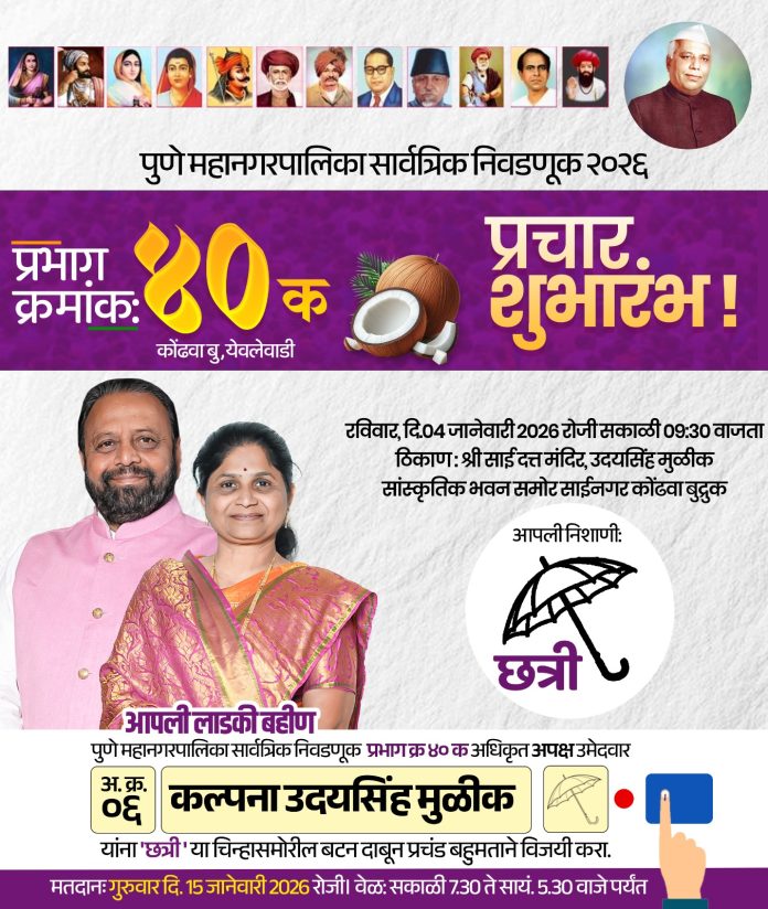 Newsworldmarathi Pune: पुणे महानगरपालिका सार्वत्रिक निवडणूक २०२६ च्या पार्श्वभूमीवर प्रभाग क्रमांक ४० (क) मधील राजकीय हालचालींना वेग आला असून, कल्पना उदयसिंह मुळीक यांनी अपक्ष उमेदवार म्हणून निवडणूक लढवण्याचा निर्णय घेतला आहे. प्रभागाच्या सर्वसमावेशक विकासाचा ध्यास घेऊन त्या जनतेसमोर उभ्या राहिल्या असून, त्यांच्या प्रचाराचा अधिकृत शुभारंभ रविवार, दिनांक ४ जानेवारी २०२६ रोजी सकाळी ९.३० वाजता होणार आहे.