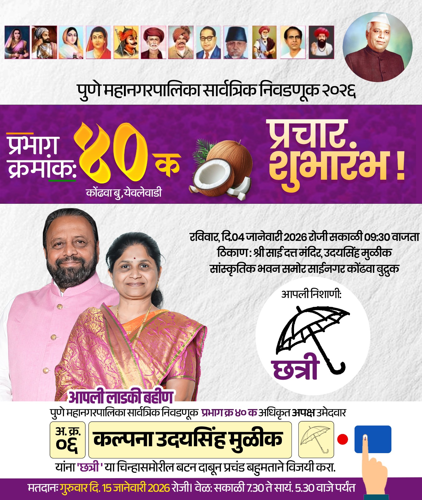 या प्रचार शुभारंभ कार्यक्रमास प्रभाग क्रमांक ४० (क) कोंढवा बुद्रुक व येवलेवाडी येथील सर्व नागरिकांनी मोठ्या संख्येने उपस्थित राहावे, असे आवाहन कल्पना उदयसिंह मुळीक यांनी केले आहे. नागरिकांचा सक्रिय सहभाग आणि पाठिंबा मिळाल्यास प्रभागाच्या विकासाला निश्चितच नवी दिशा मिळेल, असा विश्वास त्यांनी व्यक्त केला आहे.