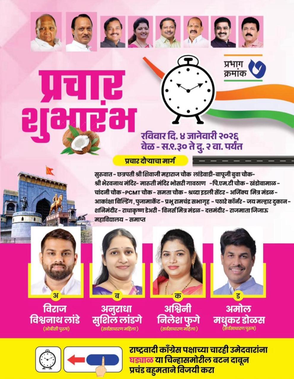Newsworldmarathi Pune: महापालिका निवडणुकीच्या पार्श्वभूमीवर प्रभाग क्रमांक ७ मध्ये राष्ट्रवादी काँग्रेस पक्षाच्या वतीने भव्य प्रचार शुभारंभाचे आयोजन करण्यात आले आहे. रविवार, दिनांक ४ जानेवारी २०२६ रोजी सकाळी १०.३० ते दुपारी २ वाजेपर्यंत हा प्रचार दौरा पार पडणार असून, प्रभागातील विविध भागांतून प्रचार रॅली काढण्यात येणार आहे. या प्रचाराच्या माध्यमातून मतदारांपर्यंत पक्षाची ध्येये, विकासाची भूमिका आणि उमेदवारांचे काम पोहोचवण्याचा प्रयत्न करण्यात येत आहे.